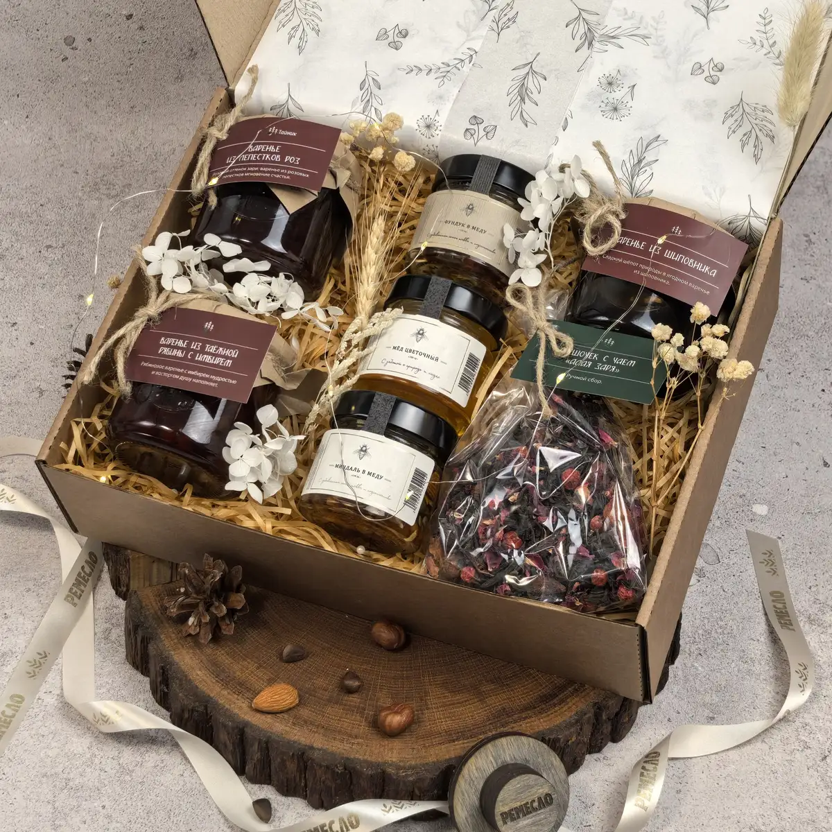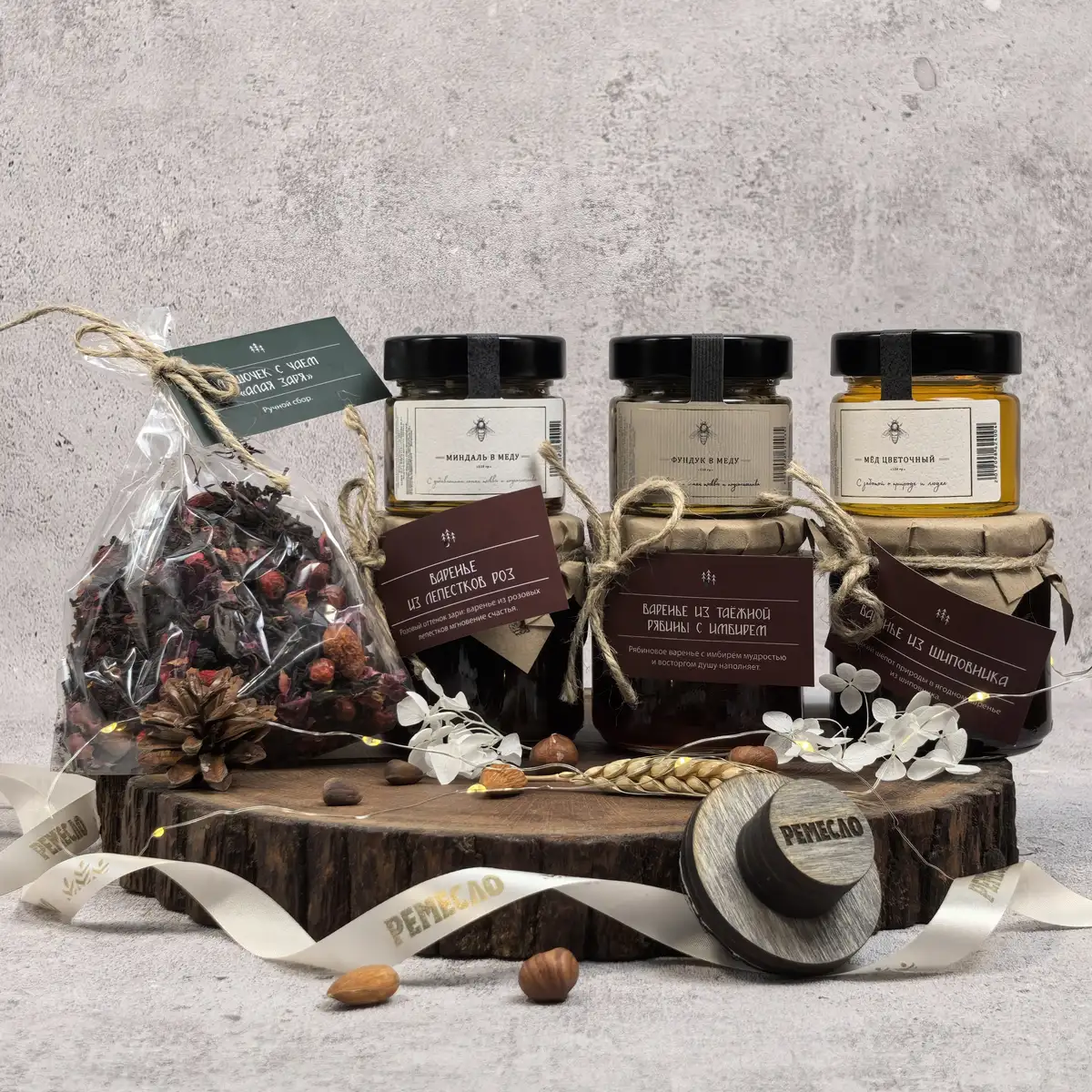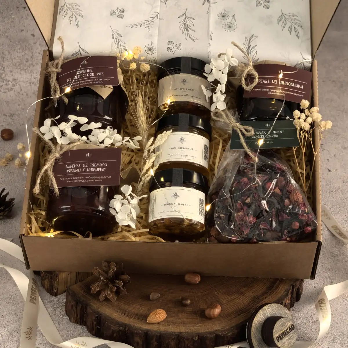 Основу набора составляют три вида мёда и три вида варенья, которые дополняют друг друга и создают богатую палитру вкусов. Цветочный мёд раскрывается мягко и деликатно, мёд с фундуком добавляет теплые ореховые ноты, а мёд с миндалём делает вкус более нежным и бархатистым. Варенье из шиповника дарит знакомое домашнее тепло, варенье из лепестков роз звучит особенно тонко и необычно, а таежная рябина с имбирем добавляет яркость, глубину и легкий пряный акцент.