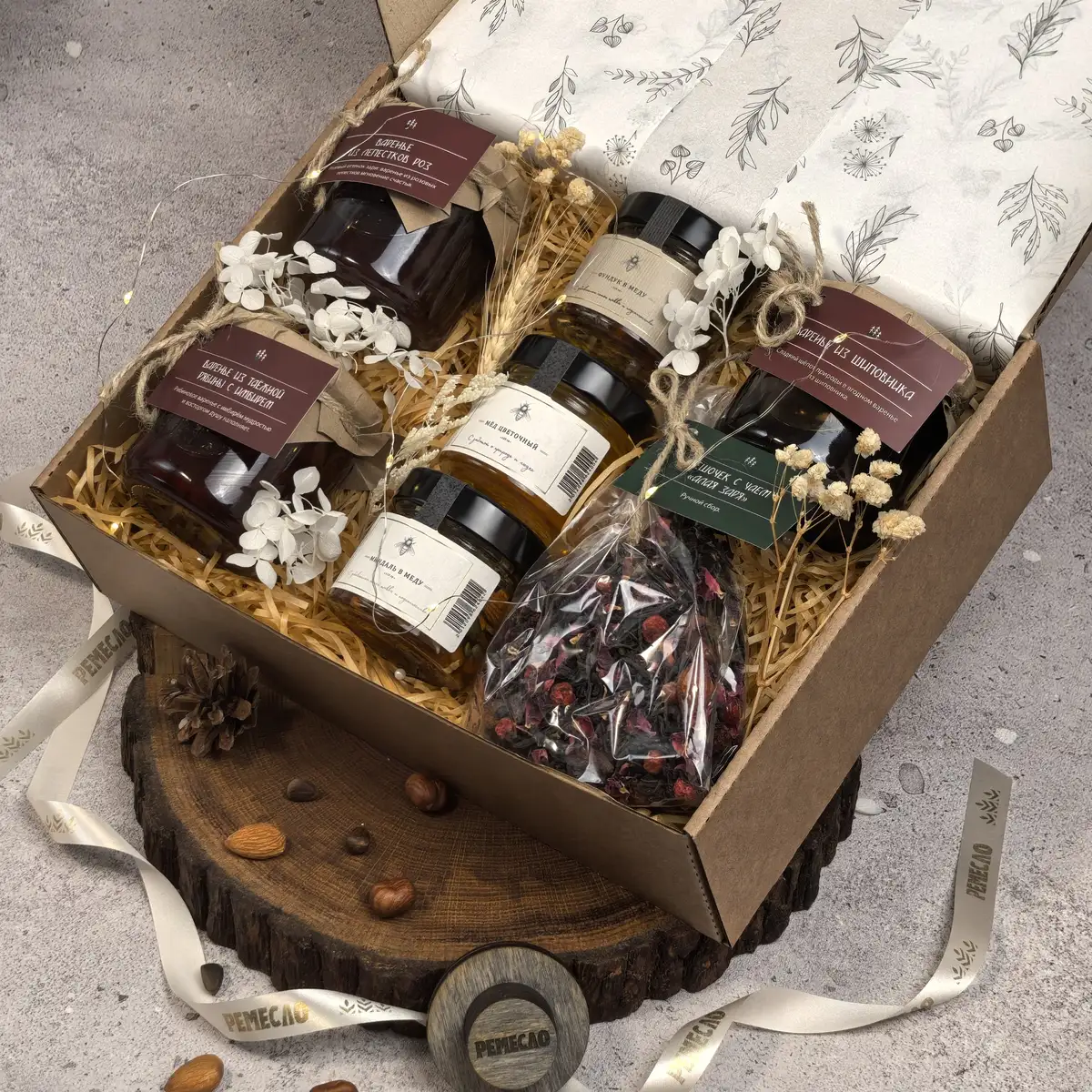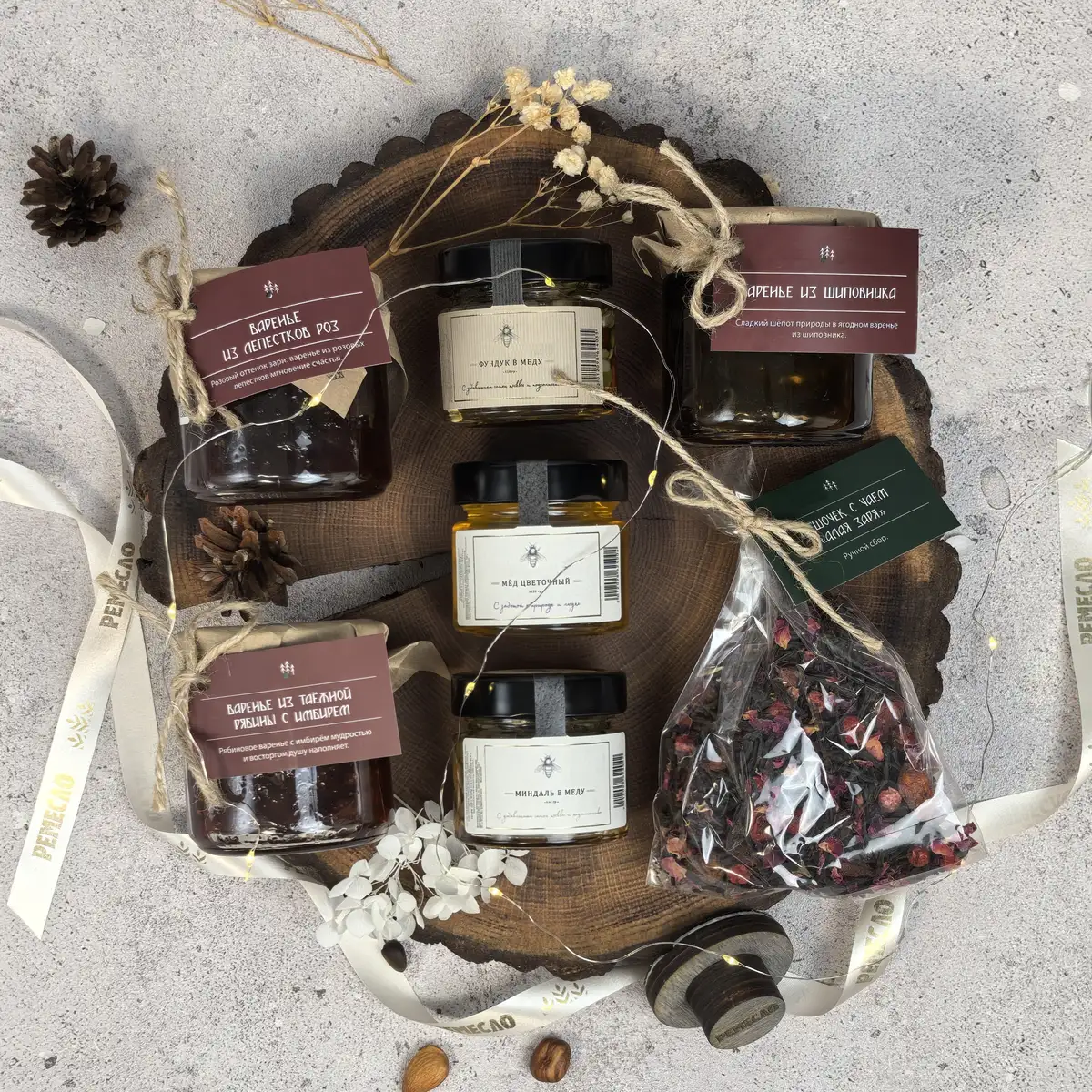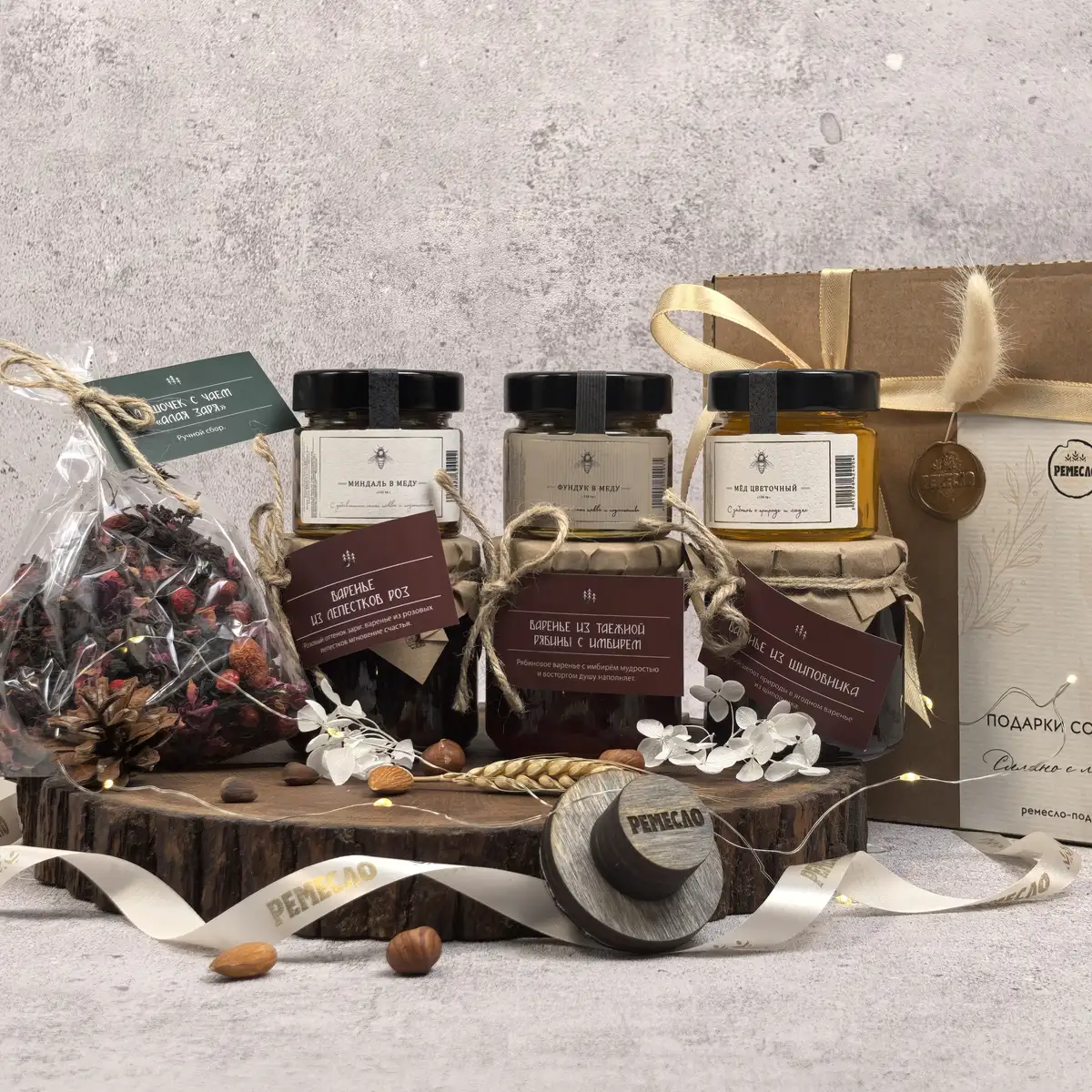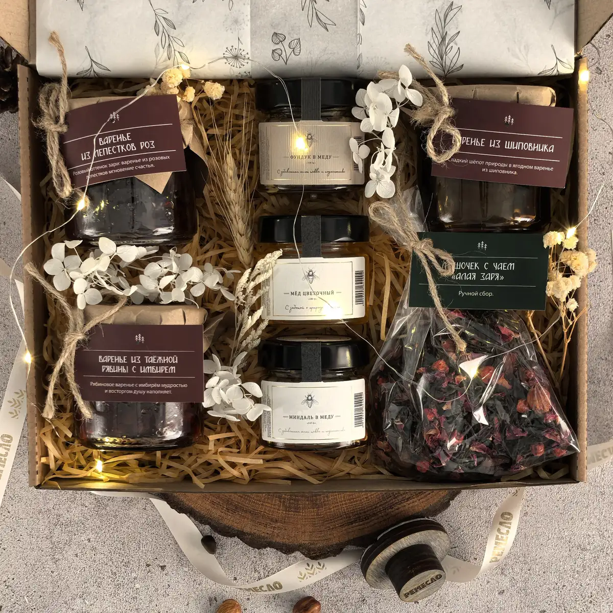 Основу набора составляют три вида мёда и три вида варенья, которые дополняют друг друга и создают богатую палитру вкусов. Цветочный мёд раскрывается мягко и деликатно, мёд с фундуком добавляет теплые ореховые ноты, а мёд с миндалём делает вкус более нежным и бархатистым. Варенье из шиповника дарит знакомое домашнее тепло, варенье из лепестков роз звучит особенно тонко и необычно, а таежная рябина с имбирем добавляет яркость, глубину и легкий пряный акцент.