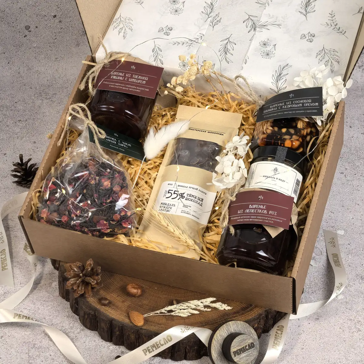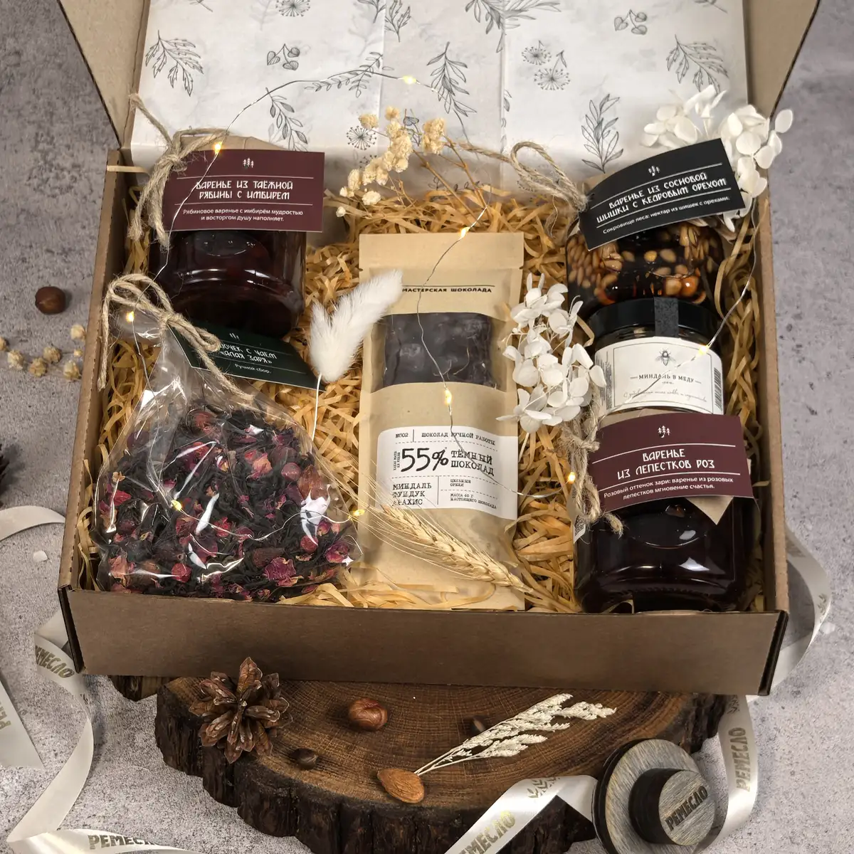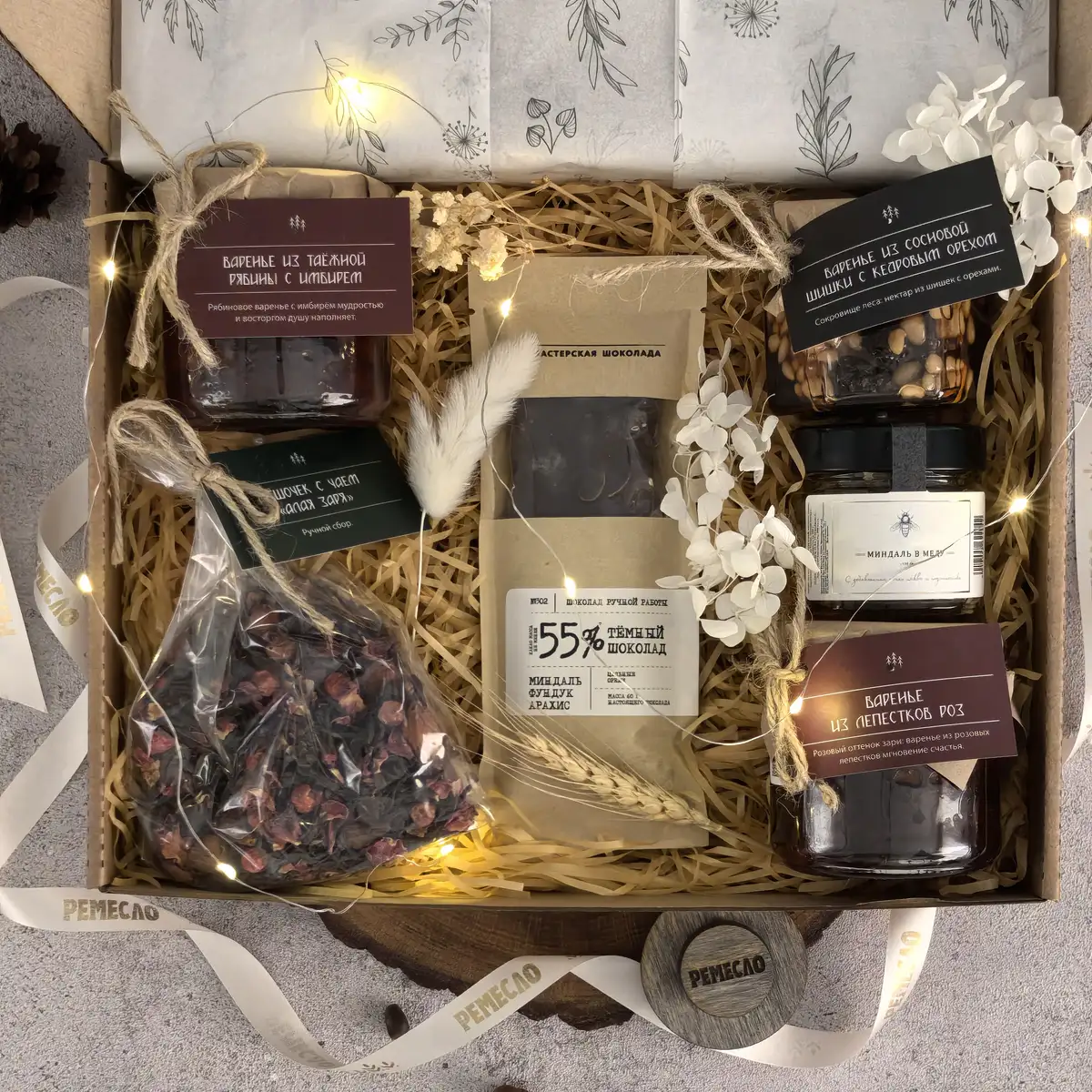 Особое очарование набору придают варенье из сосновой шишки с кедровым орехом и варенье из таежной рябины с имбирем. Эти вкусы звучат необычно, благородно и запоминаются своей глубиной. Они создают ощущение редкого гастрономического подарка, в котором есть природная роскошь, северный шарм и впечатляющая оригинальность. Такое сочетание делает набор не просто красивым, а по-настоящему исключительным.