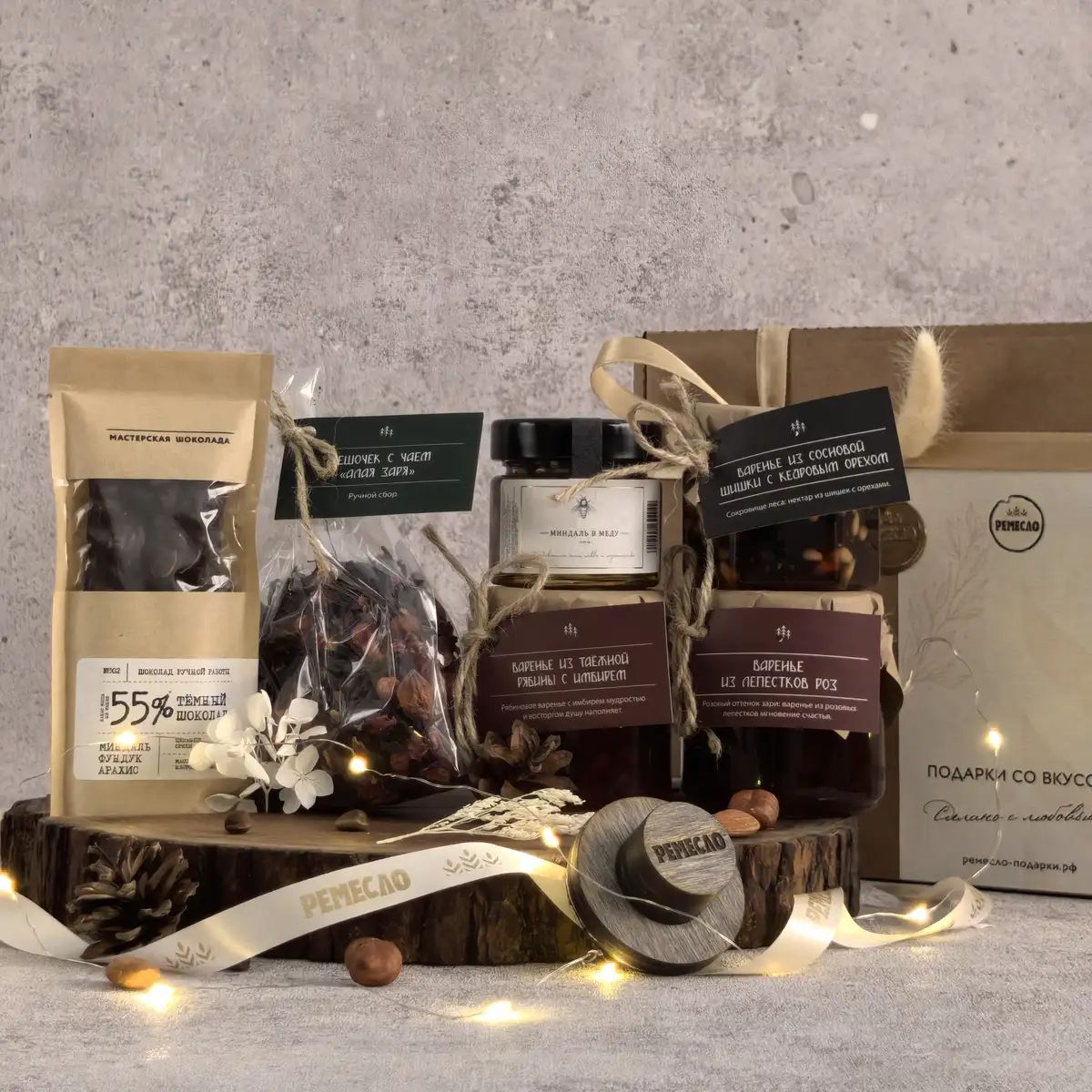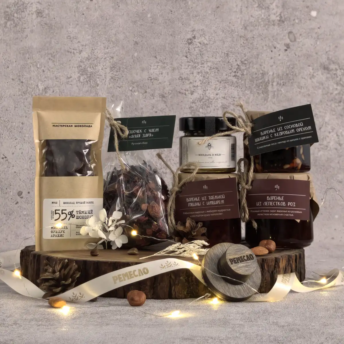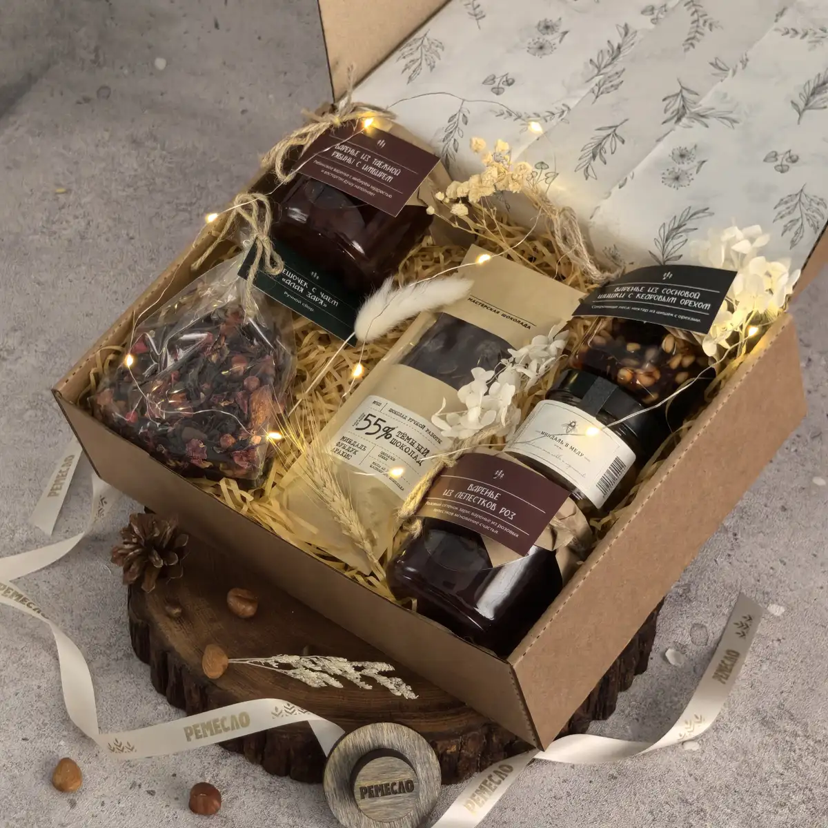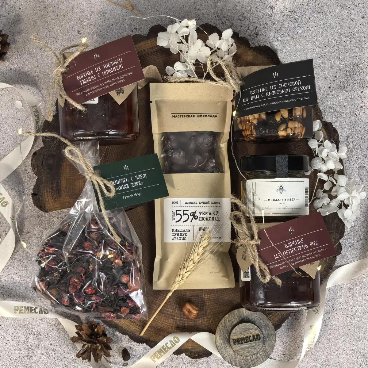 Особое очарование набору придают варенье из сосновой шишки с кедровым орехом и варенье из таежной рябины с имбирем. Эти вкусы звучат необычно, благородно и запоминаются своей глубиной. Они создают ощущение редкого гастрономического подарка, в котором есть природная роскошь, северный шарм и впечатляющая оригинальность. Такое сочетание делает набор не просто красивым, а по-настоящему исключительным.