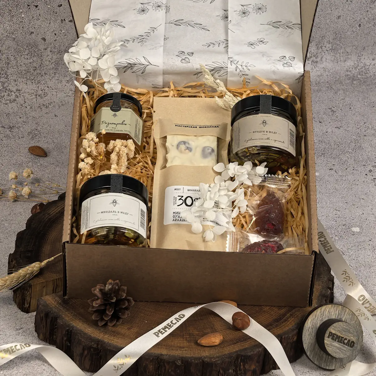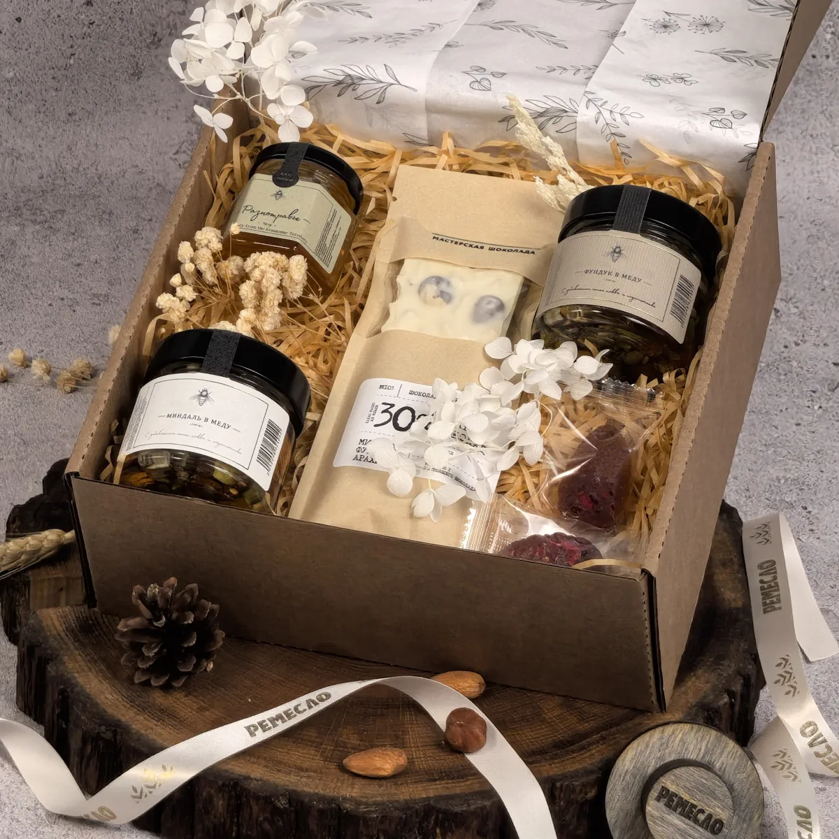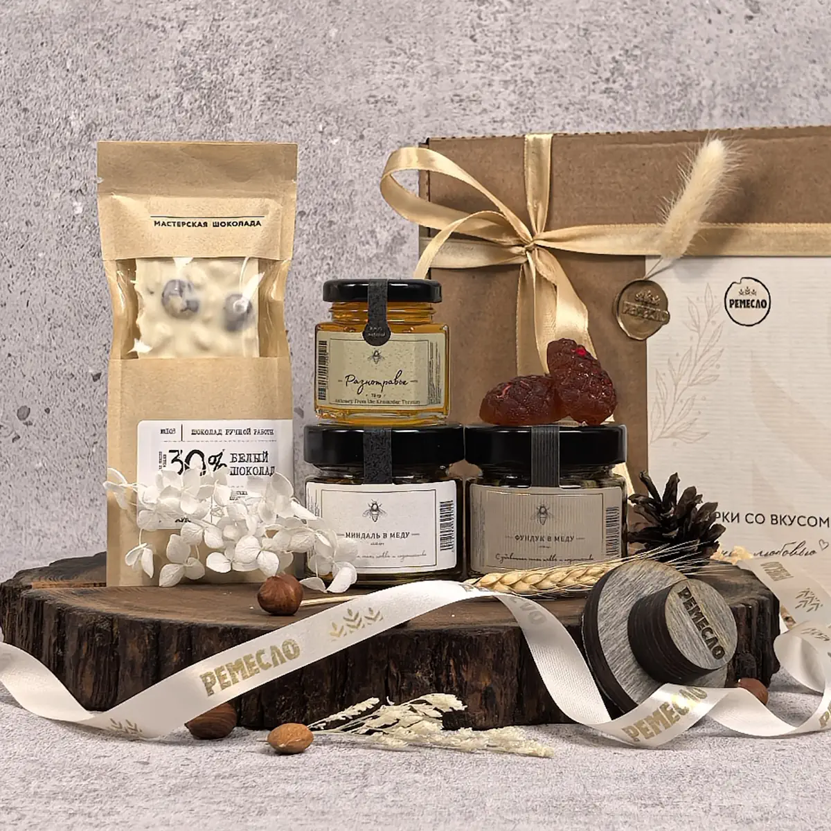 Каждый элемент набора выбран так, чтобы создать не просто сладкий подарок, а красивую гастрономическую историю. В нем ощущаются внимание к качеству, уважение к натуральным продуктам и стремление подарить нечто действительно достойное, элегантное и душевное.