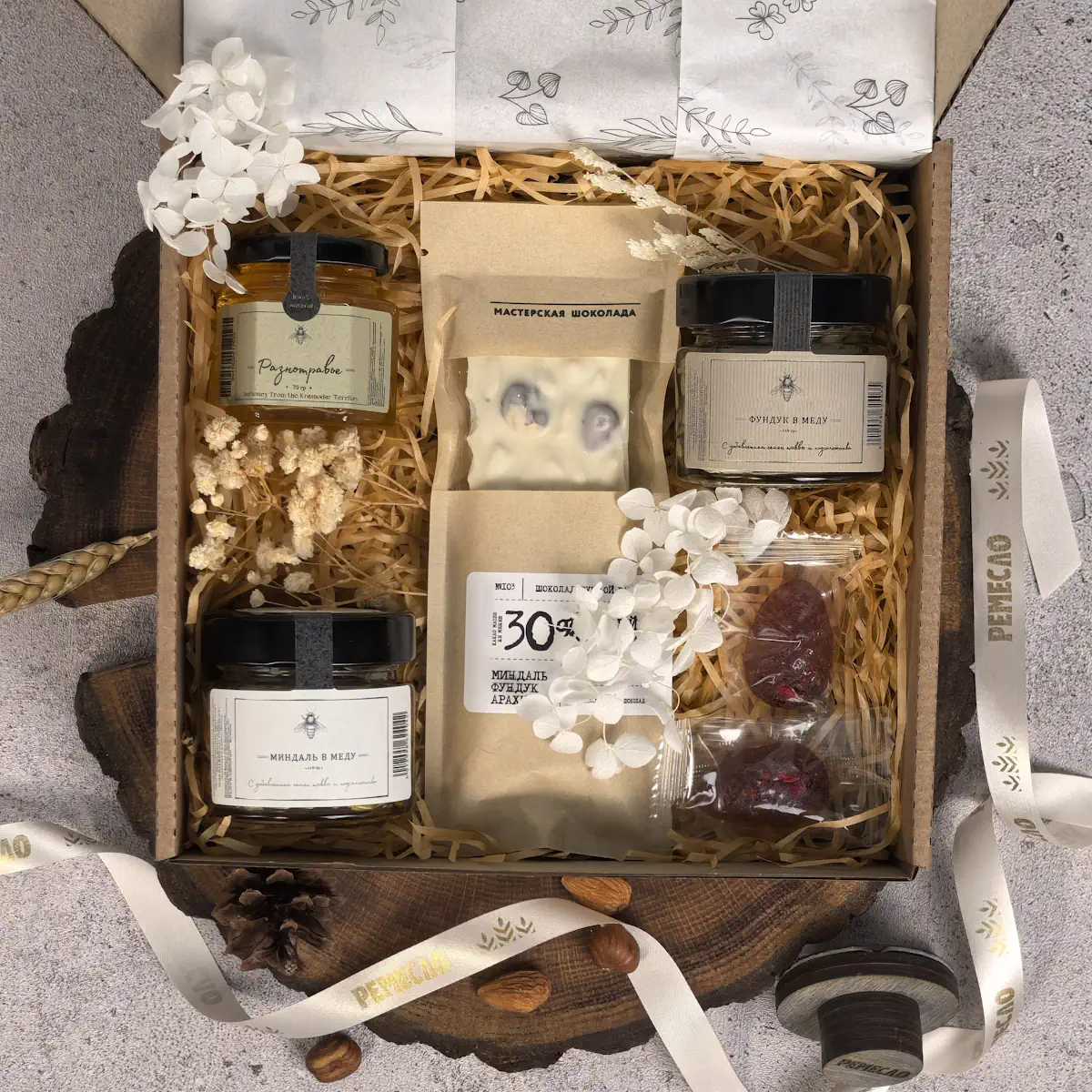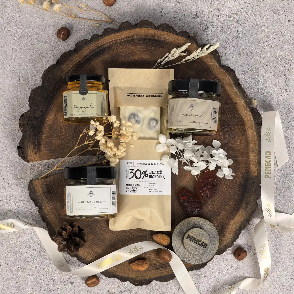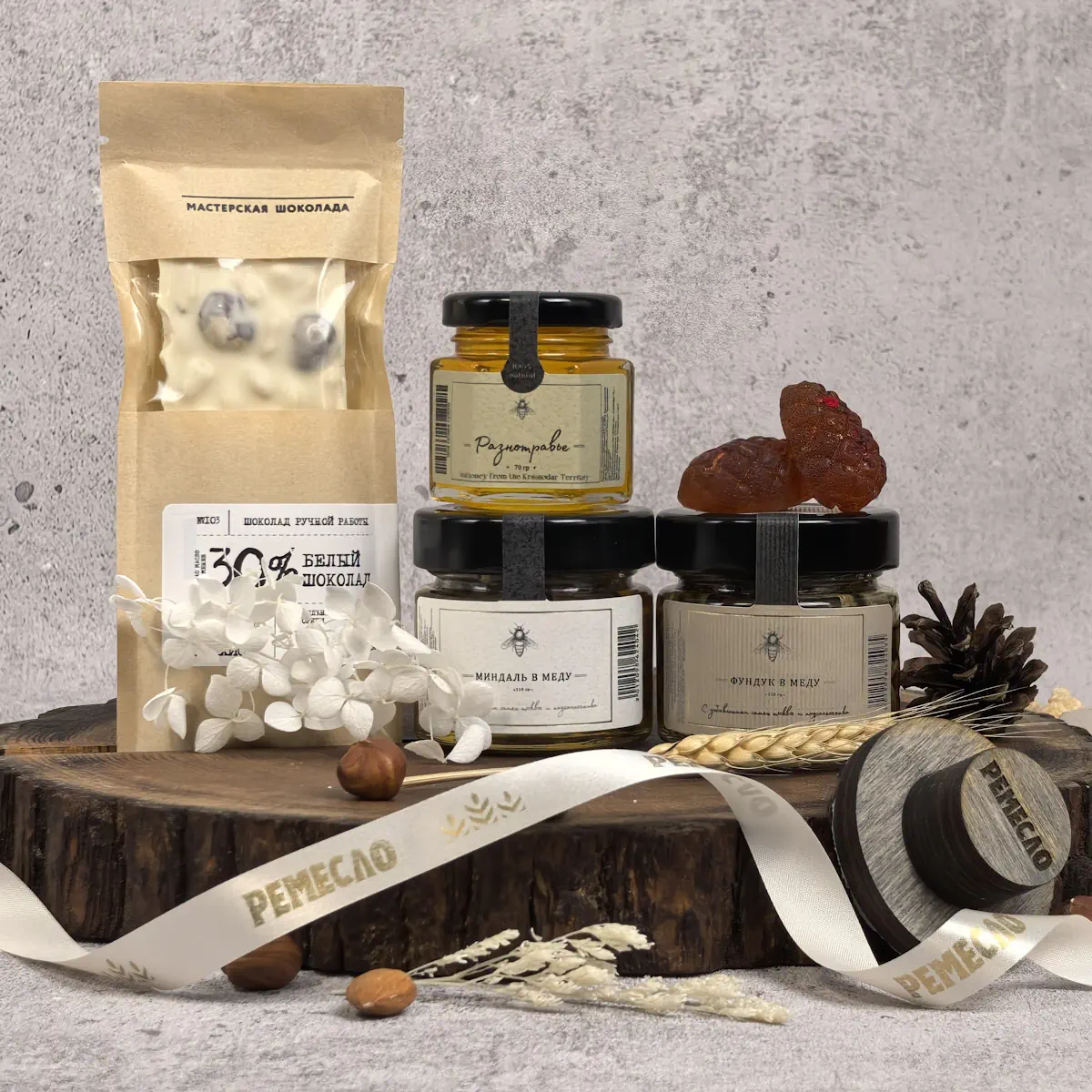 Каждый элемент набора выбран так, чтобы создать не просто сладкий подарок, а красивую гастрономическую историю. В нем ощущаются внимание к качеству, уважение к натуральным продуктам и стремление подарить нечто действительно достойное, элегантное и душевное.
