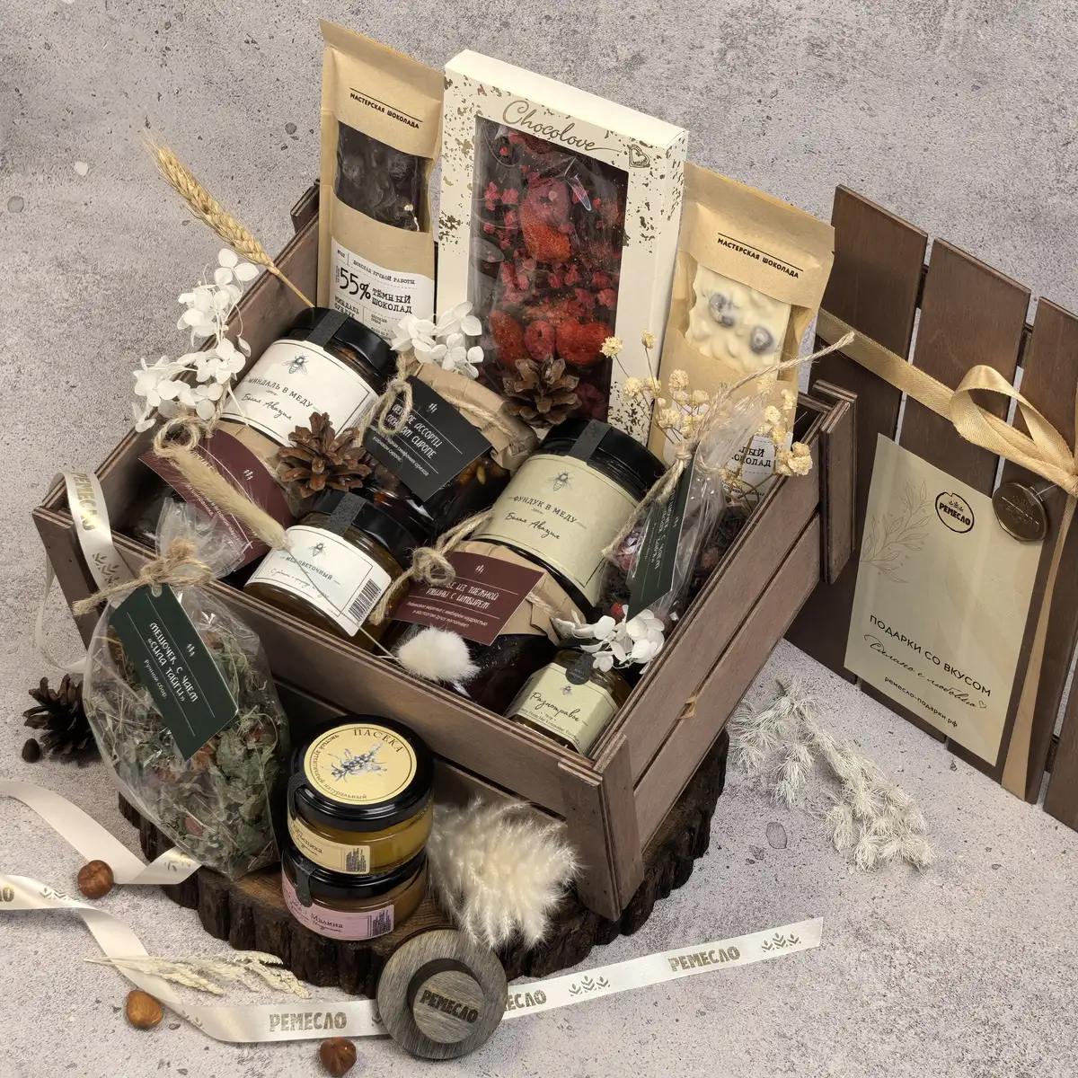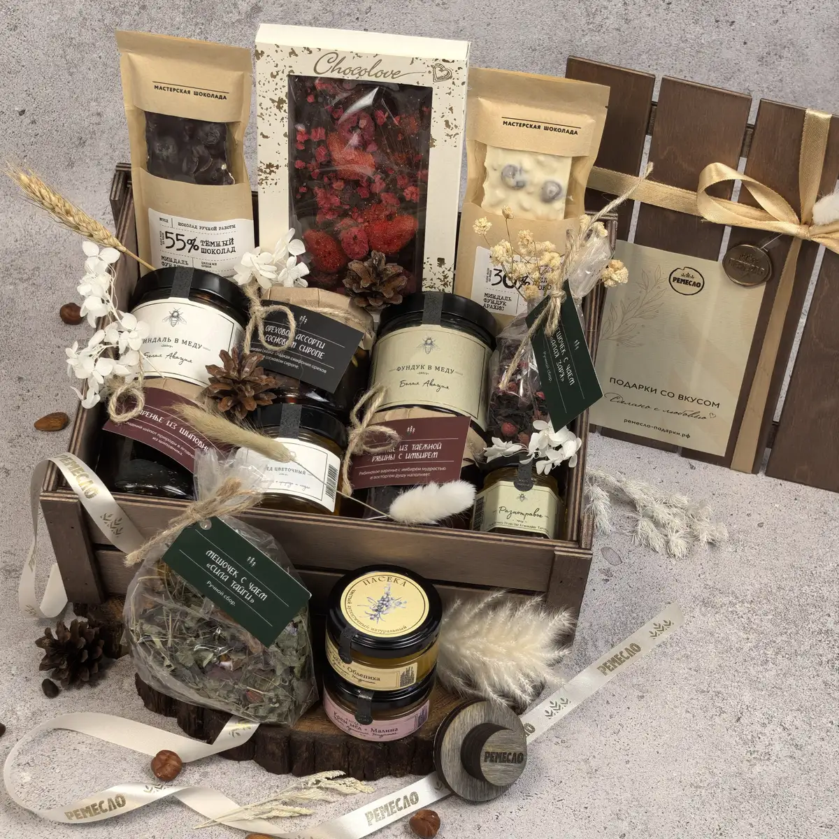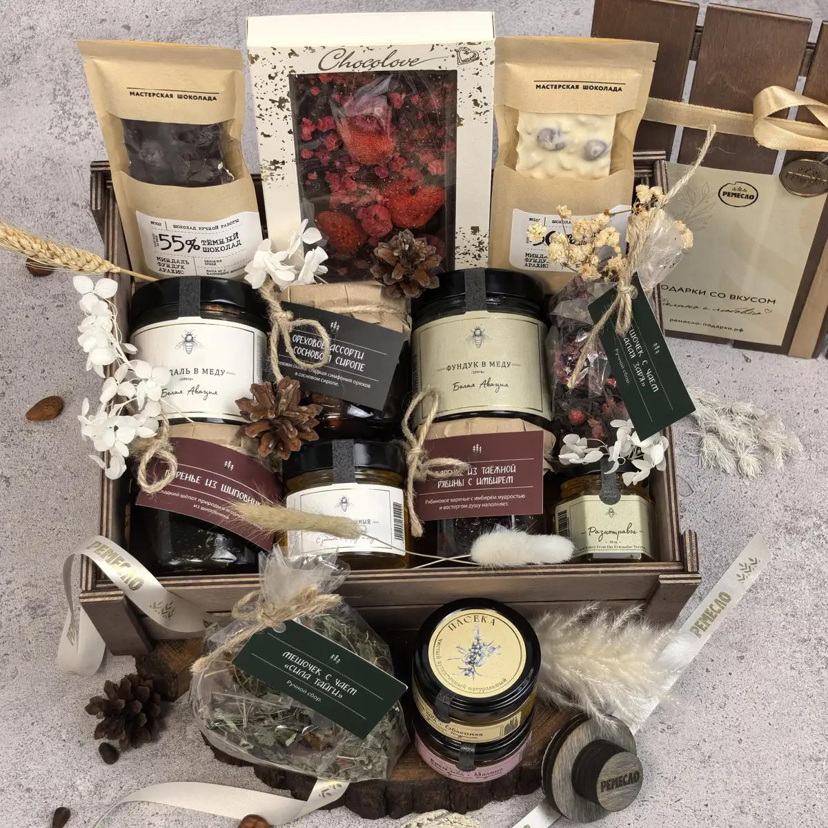 Каждый элемент подобран так, чтобы дарить не только удовольствие, но и ощущение качества. Натуральный мёд, ягоды, орехи, травы, ручной шоколад и бельгийский шоколад с клубникой и малиной создают образ дорогого, насыщенного подарка с выразительным характером. Это тот случай, когда вкус, эстетика и состав говорят о внимании к деталям лучше любых слов.