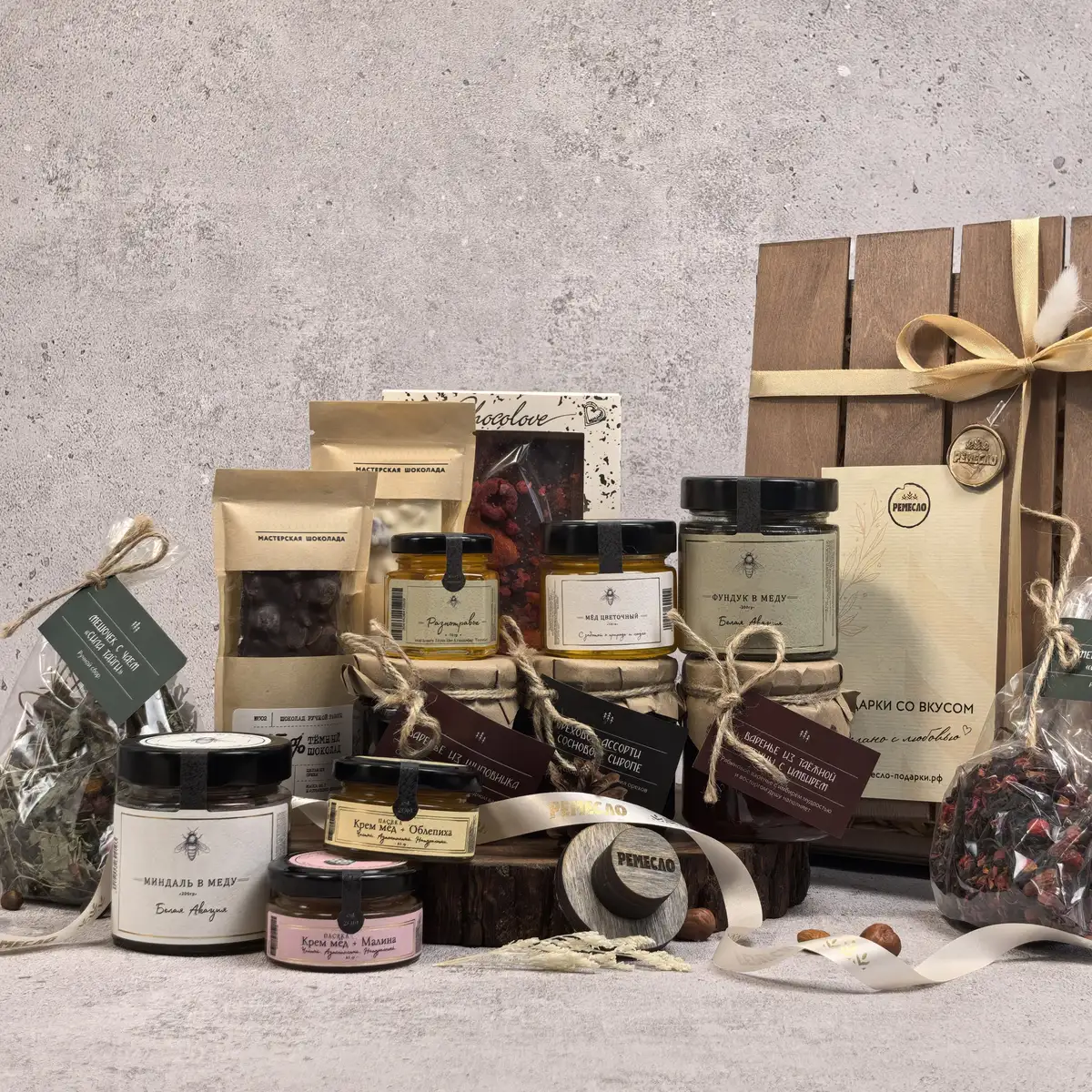 Набор уже оформлен как полноценный красивый презент, который приятно вручать сразу. Он выглядит богато, празднично и эстетично, а разнообразие баночек, вкусов и фактур внутри создает впечатление щедрого, тщательно собранного подарка. Вы получаете готовое решение в том оформлении, которое представлено на фото.
